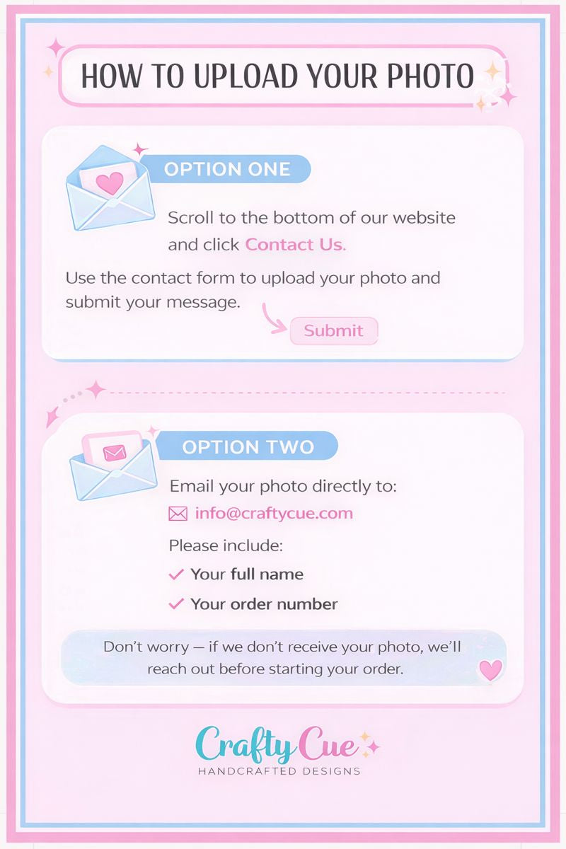 ● Click HERE after your purchase to upload your photo or email it to us.